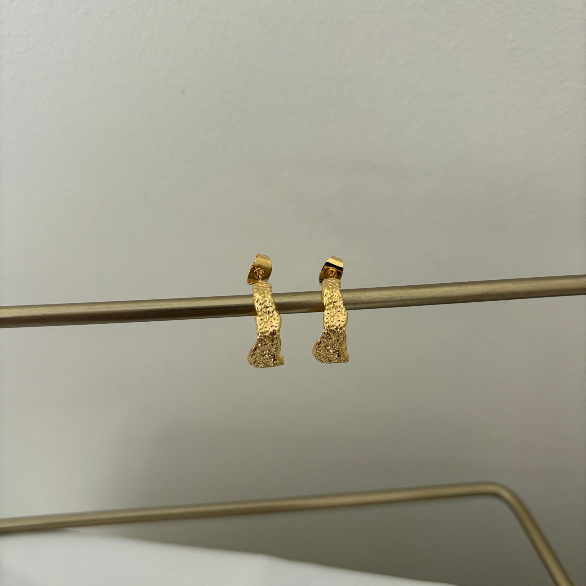 Aros tipo argolla con textura martillada que reflejan la luz de forma sutil y natural.