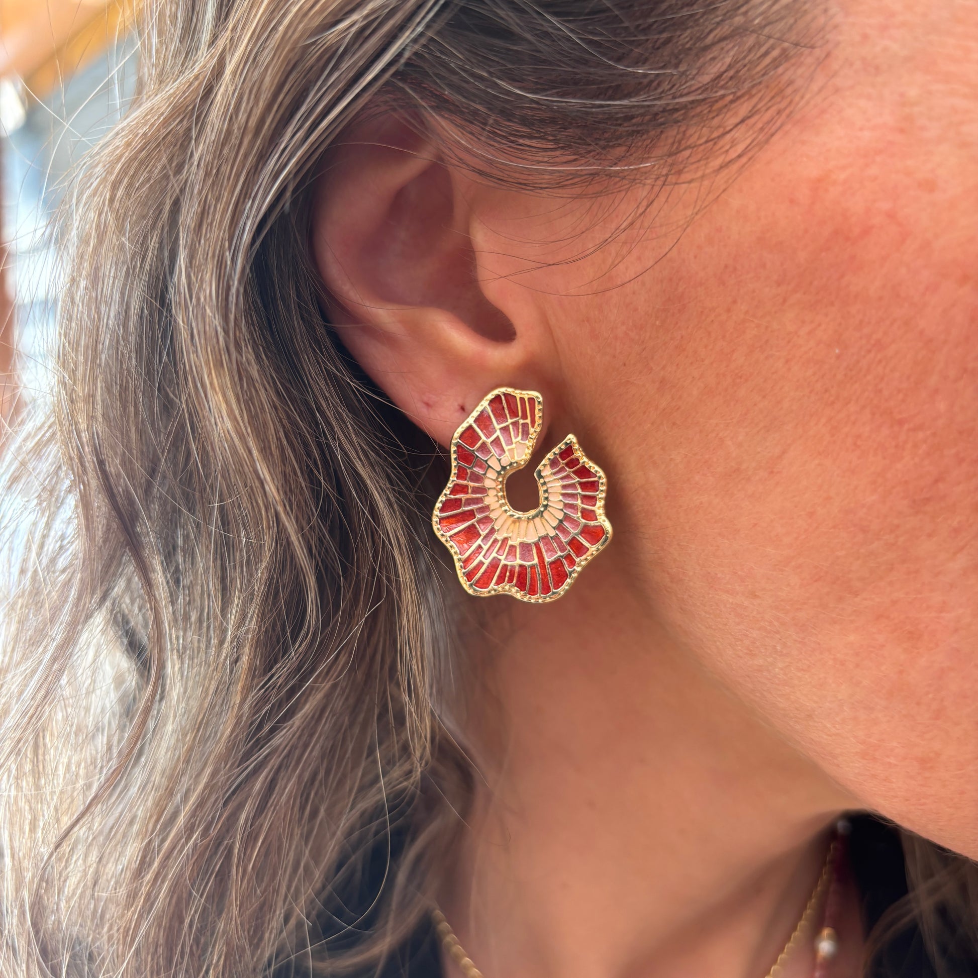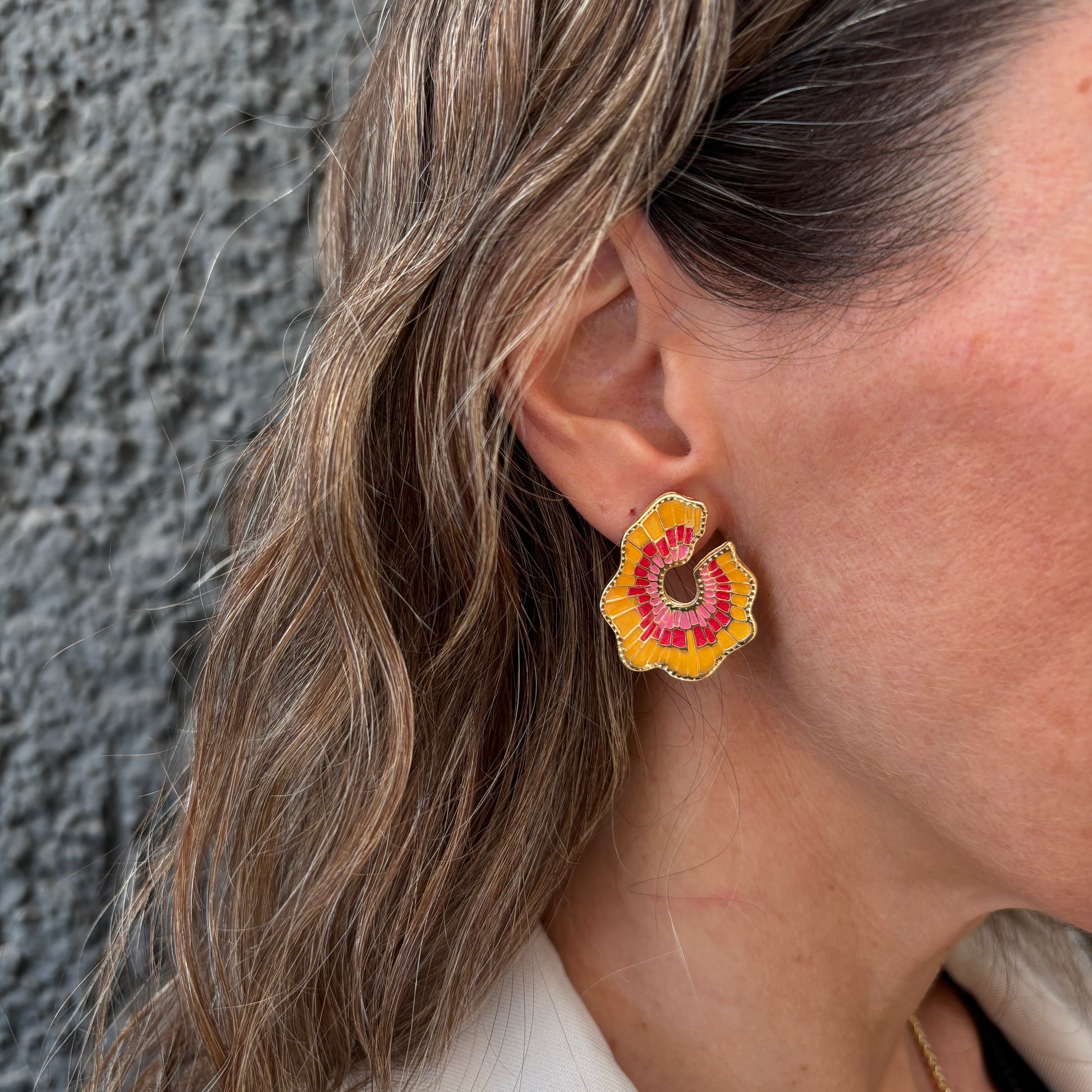 Agrega un toque tropical y vibrante a tu estilo. Inspirados en la flor Hibisco símbolo de belleza femenina y alegría, estos aros en forma de flor esmaltados a mano los hace únicos y llenos de vida.
