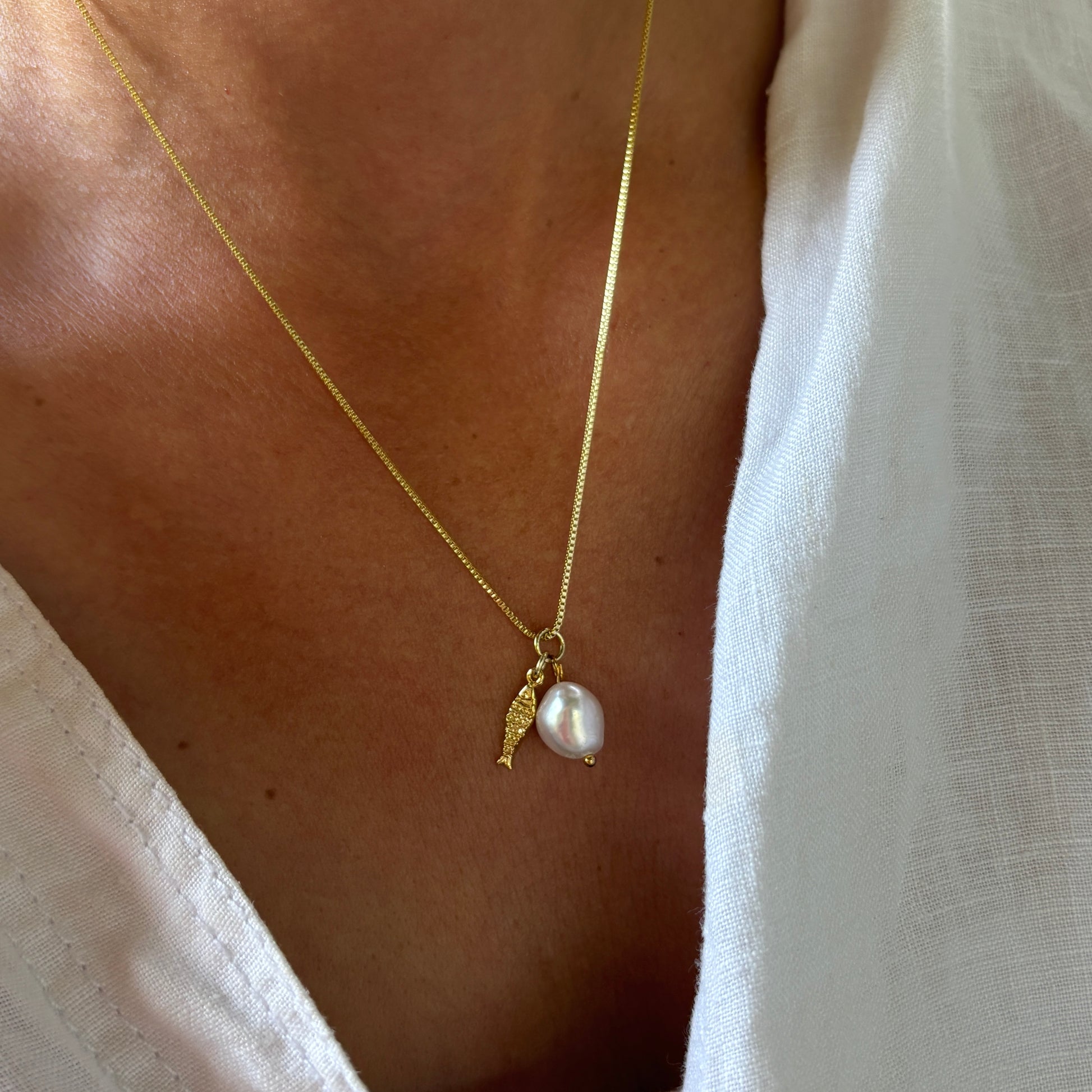 Inspirado en la calma del mar y la belleza de lo natural, el Collar Marea de cadena veneciana combina un delicado dije de perla con un pequeño pez, símbolo de origen, fluidez y conexión con la naturaleza.