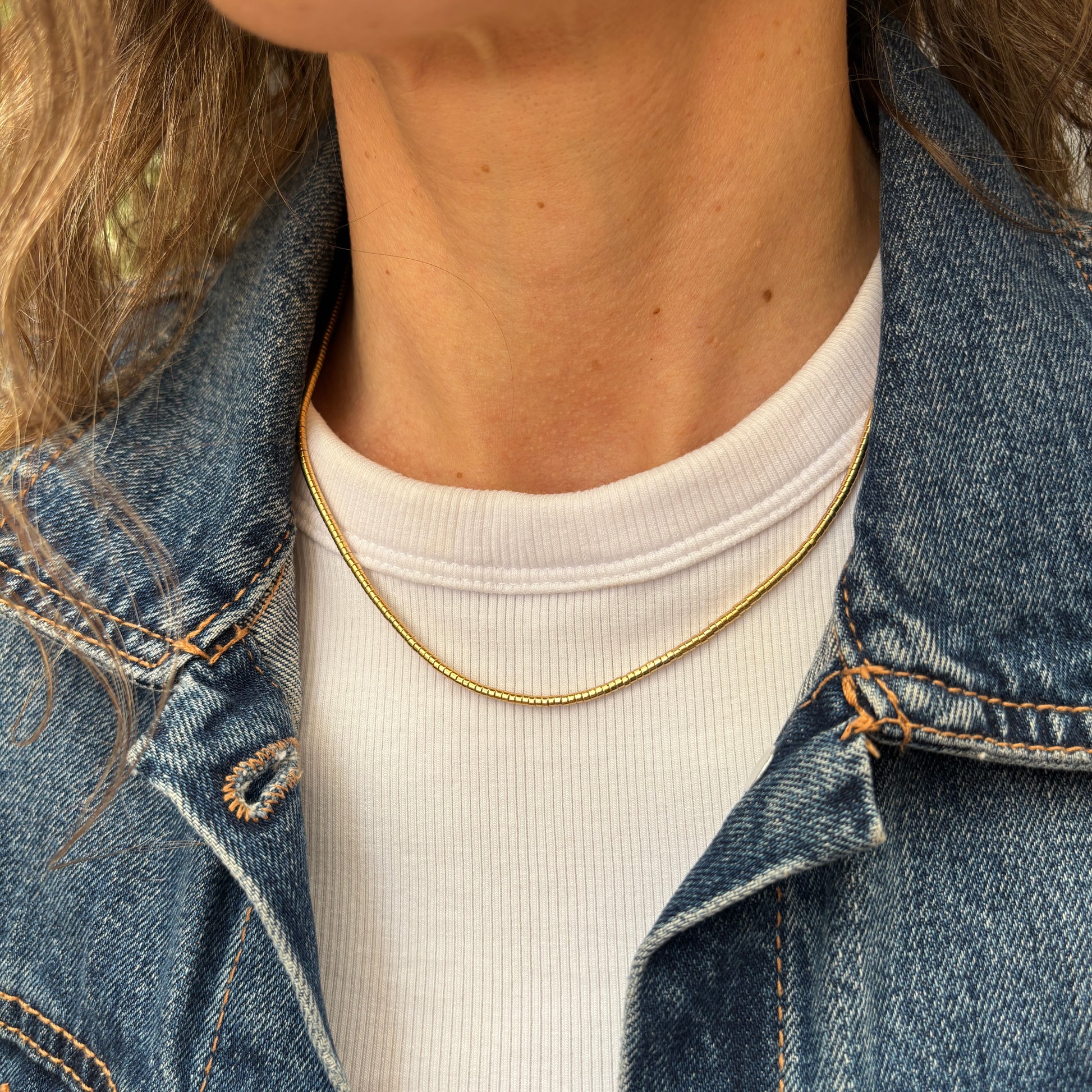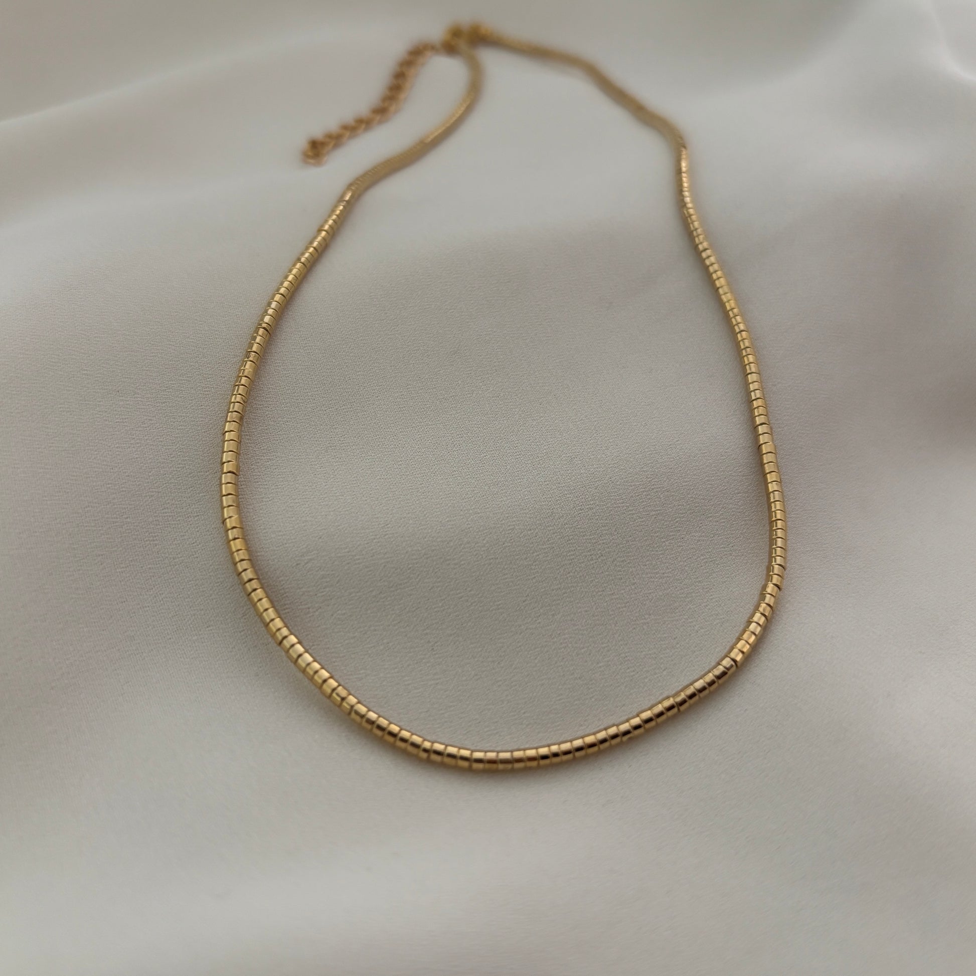 El collar Pipa, es un collar de mostacillas doradas hecho a mano, muy delicado y elegante, ideal para combinar con otros más largos y darle un estilo único.
