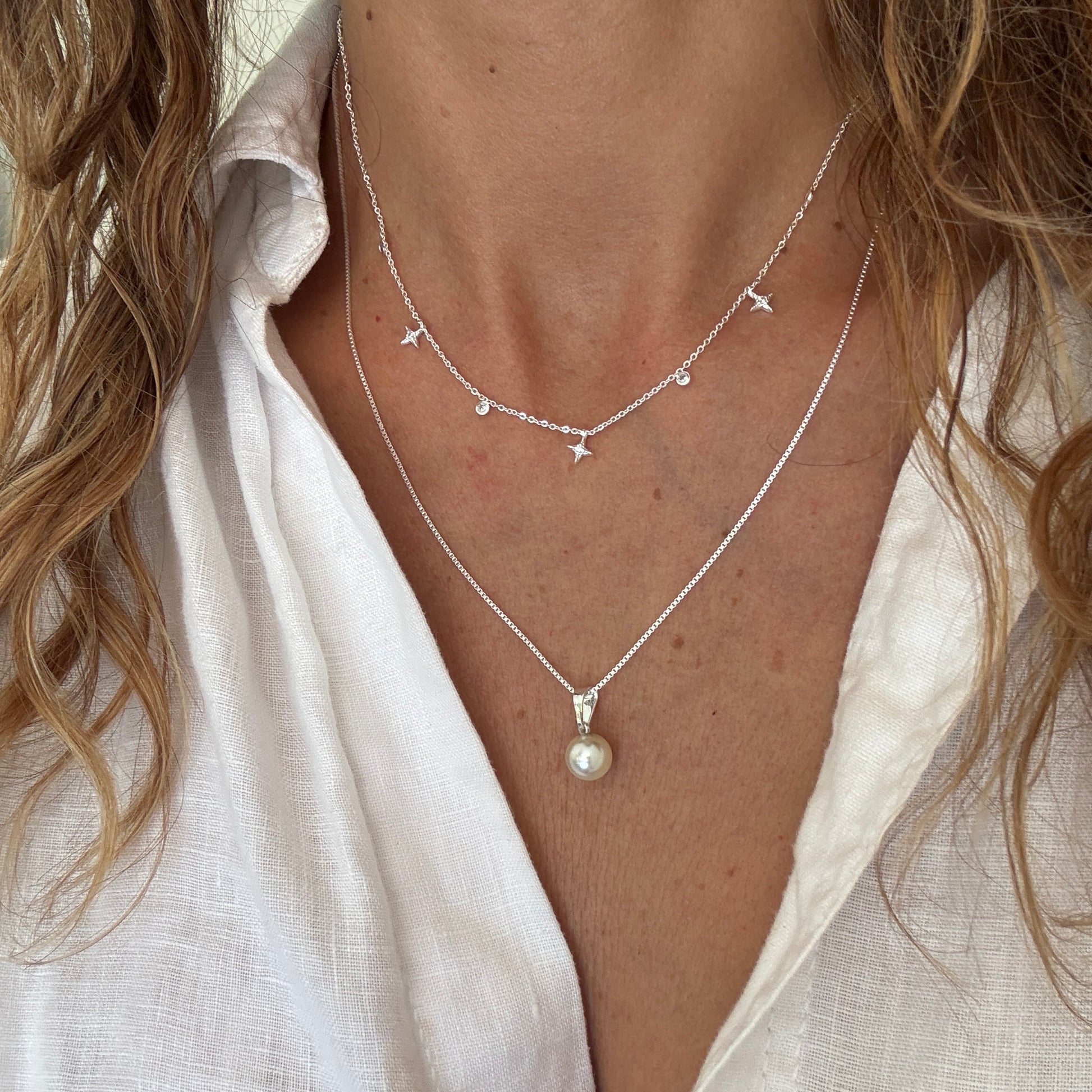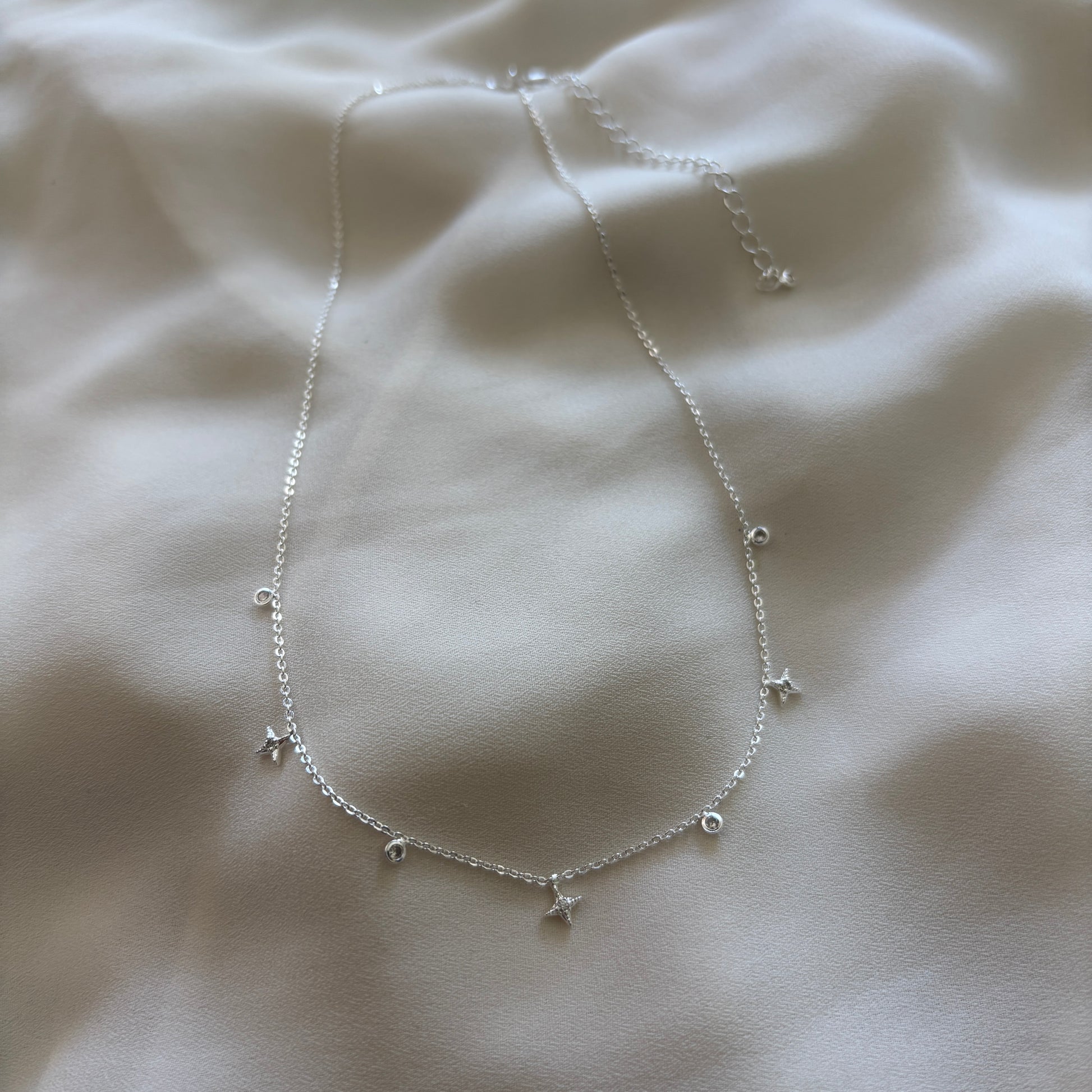El Collar Sunset, una pieza delicada y elegante en su diseño. Está formado por una cadena con 3 estrellas y 4 puntos de circón para aportar luz y sofisticación.