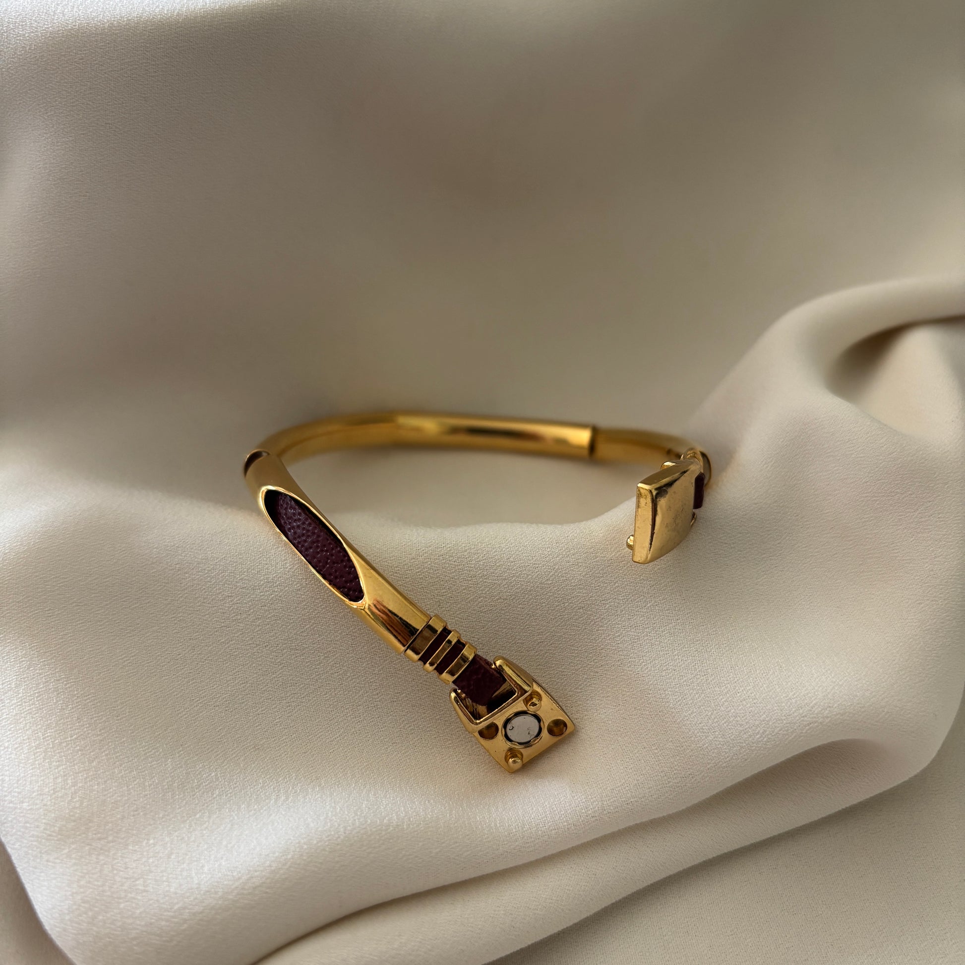 La Pulsera Catarina, es un diseño exclusivo para esta temporada, es una pulsera de cuero entrelazado en un tipo de brazalete bañado en oro.